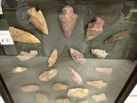 Framed Mississippi Native American Arrow Heads, tools, pottery shards, and shadow box, framed, 16"h., 13"w, Location Left Office 1 Framed Mississippi Native American Arrow Heads, tools, pottery shards, and shadow box, framed, 16"h., 13"w, Location Left Office 1