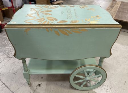 Painted Serving Tea Cart, glass tray has crack, 28"h., 31"w. Painted Serving Tea Cart, glass tray has crack, 28"h., 31"w.