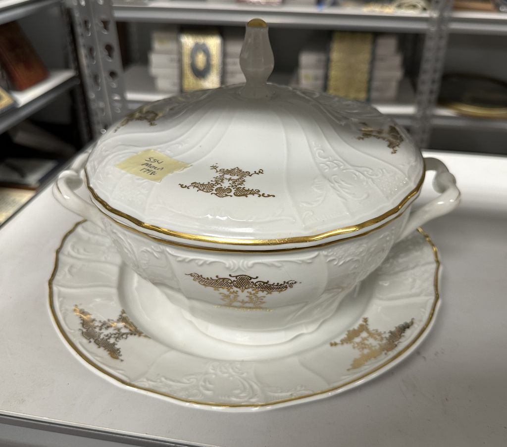 Czech Gold and White Porcelain Tureen and Underplate, missing ladle, Location Back Metal Shelves Czech Gold and White Porcelain Tureen and Underplate, missing ladle, Location Back Metal Shelves