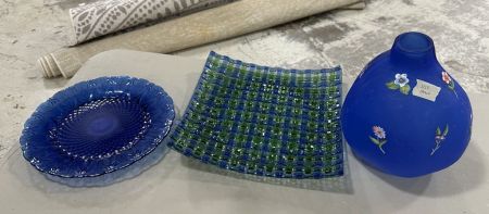 Three Blue Art Glassware, Vase, charger, and plate. Three Blue Art Glassware, Vase, charger, and plate.