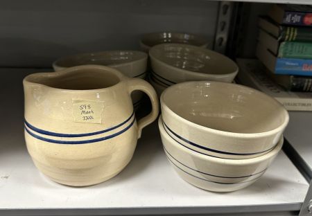 Group of Stoneware Pottery, blue label crock, Location Right Metal Shelves Group of Stoneware Pottery, blue label crock, Location Right Metal Shelves