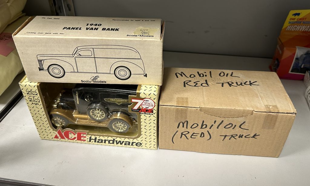 Collectible Diecast, 1940 Pane Van Bank, Ace Hardware, Mobil Oil Red Trunk Location Right Metal Shelves Collectible Diecast, 1940 Pane Van Bank, Ace Hardware, Mobil Oil Red Trunk Location Right Metal Shelves