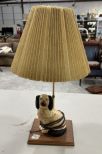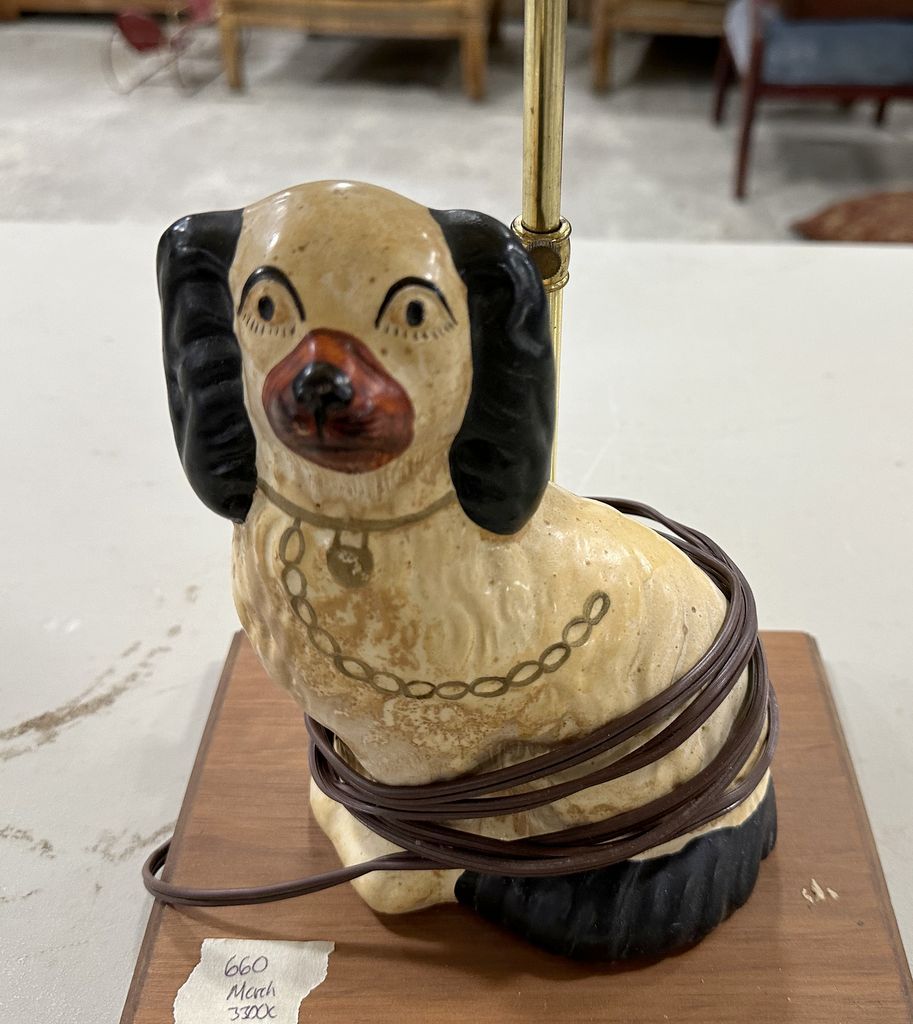 Vintage Staffordshire Style Table Lamp, hand panted, wood base, 23"h, Location Right Metal Shelves Vintage Staffordshire Style Table Lamp, hand panted, wood base, 23"h, Location Right Metal Shelves