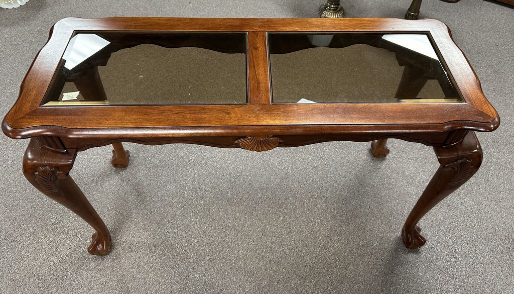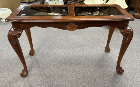 Reproduction Ball-n-Claw Cherry Sofa Table, two glass sections, 29"h., 47"w. Reproduction Ball-n-Claw Cherry Sofa Table, two glass sections, 29"h., 47"w.