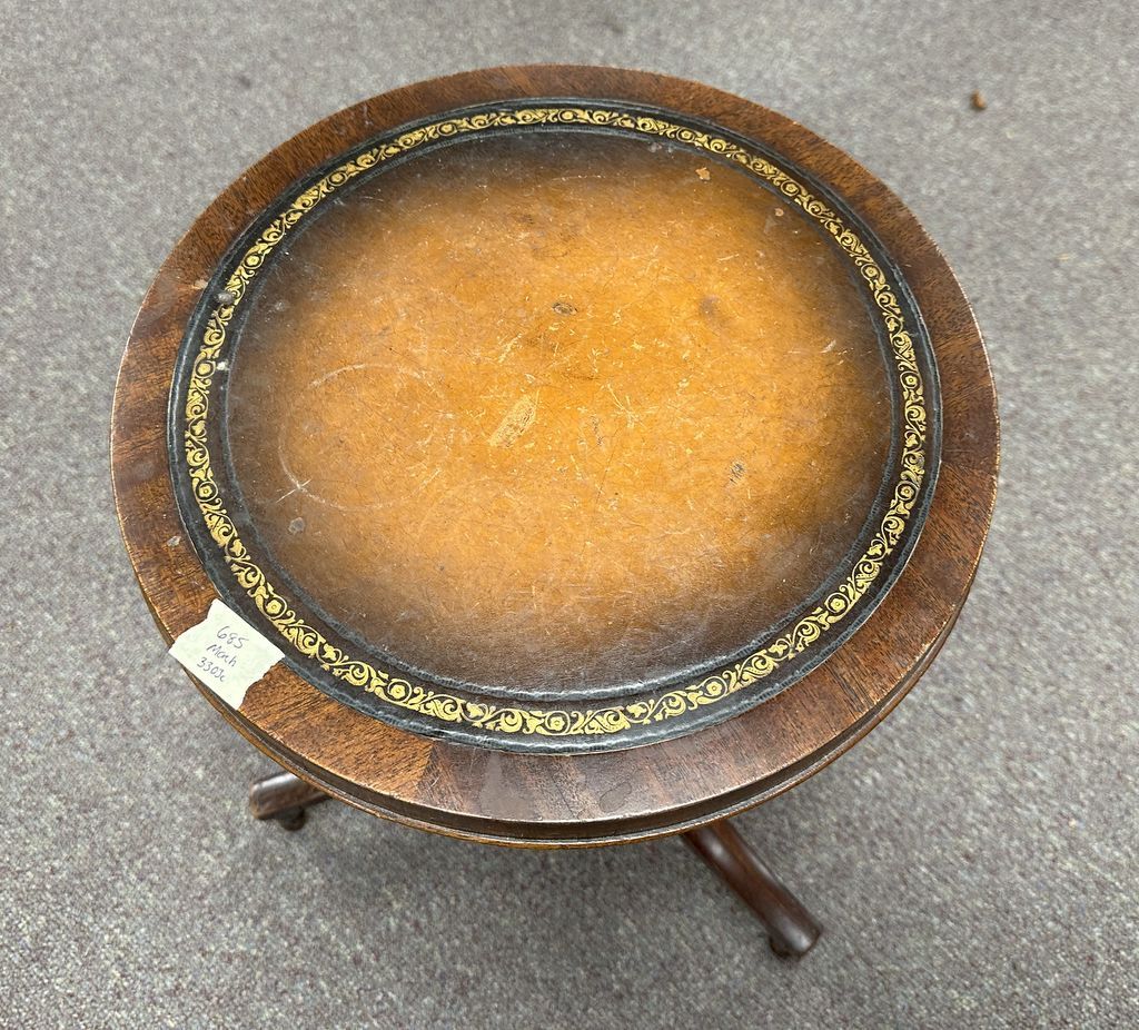 Duncan Phyfe Mahogany Pedestal Table, leather top, 20"h., 14"dia. Duncan Phyfe Mahogany Pedestal Table, leather top, 20"h., 14"dia.