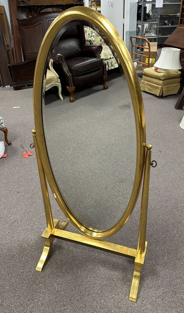 Modern Gold Gilt Cheval Dressing Mirror, has a chip on frame, 55"h., 24"w. Modern Gold Gilt Cheval Dressing Mirror, has a chip on frame, 55"h., 24"w.