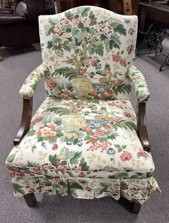 Traditional Style Upholstered Arm Chair, cherry wood frame. Location Row 1 Traditional Style Upholstered Arm Chair, cherry wood frame. Location Row 1