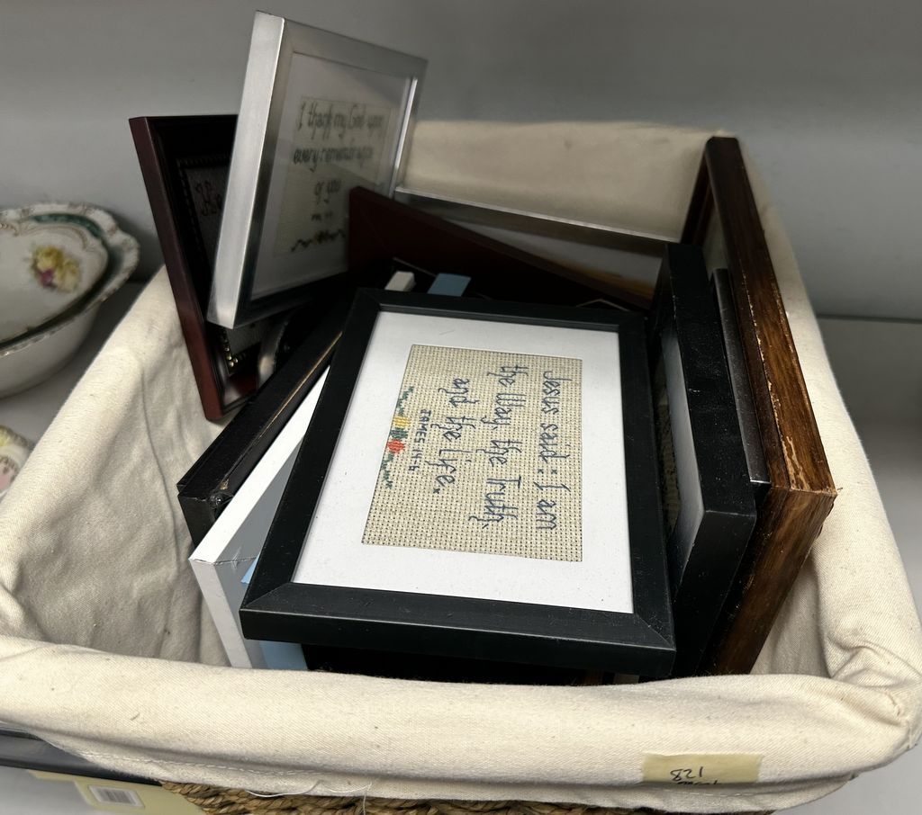 Box of Framed Cross Stitches, Location Right Metal Shelves Box of Framed Cross Stitches, Location Right Metal Shelves