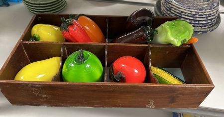 Box of Glass Fruit and Vegs, in wood crate, Location Right Metal Shelves Box of Glass Fruit and Vegs, in wood crate, Location Right Metal Shelves