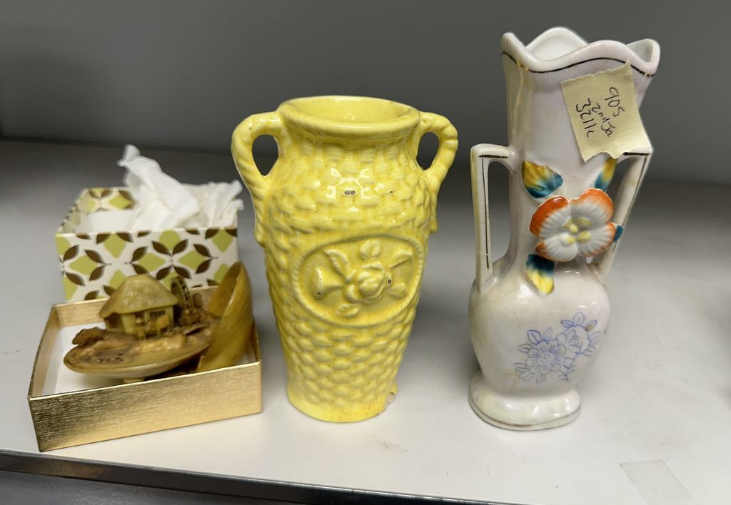Porcelain Vase, Basket Ceramic Vase, and Asian Hand Crafted Sculpture, Location Right Metal Shelves Porcelain Vase, Basket Ceramic Vase, and Asian Hand Crafted Sculpture, Location Right Metal Shelves