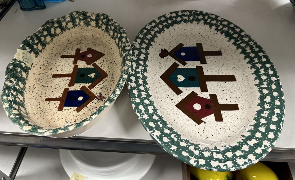 Birdhouse Painted Ceramic Platters, Location Right Metal Shelves Birdhouse Painted Ceramic Platters, Location Right Metal Shelves