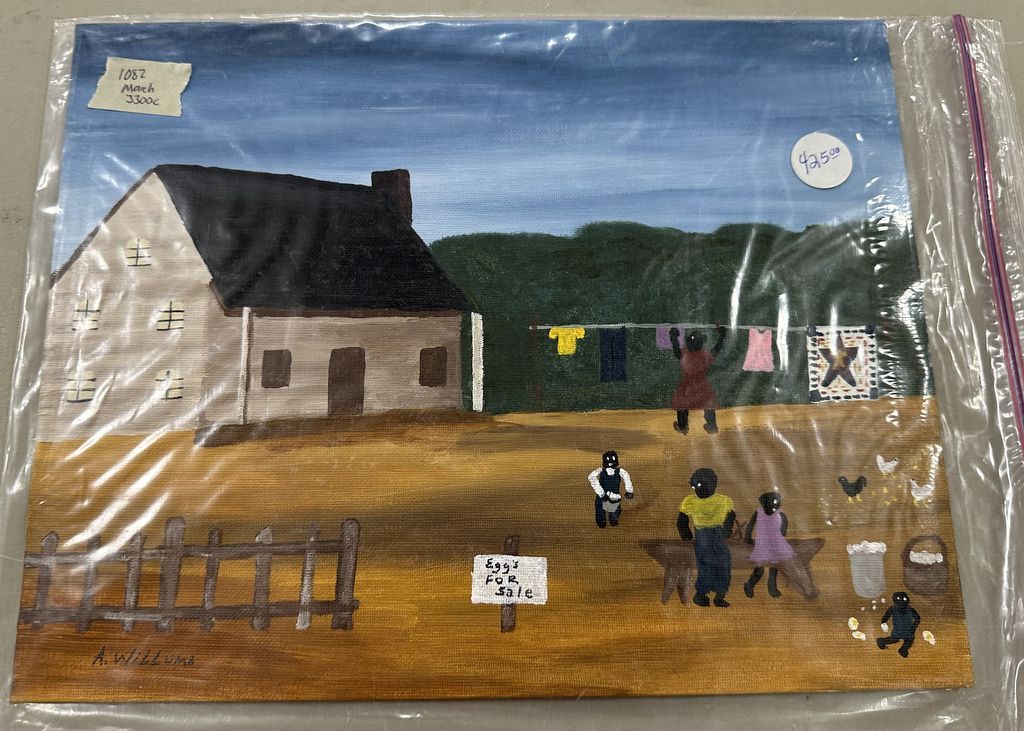 Alphonso Willums "The Egg Stand" Painting, unframed, 11" x 14", African American Folk Artist Alphonso Willums, Born in Maryland, Location Left Office 1 Alphonso Willums "The Egg Stand" Painting, unframed, 11" x 14", African American Folk Artist Alphonso Willums, Born in Maryland, Location Left Office 1