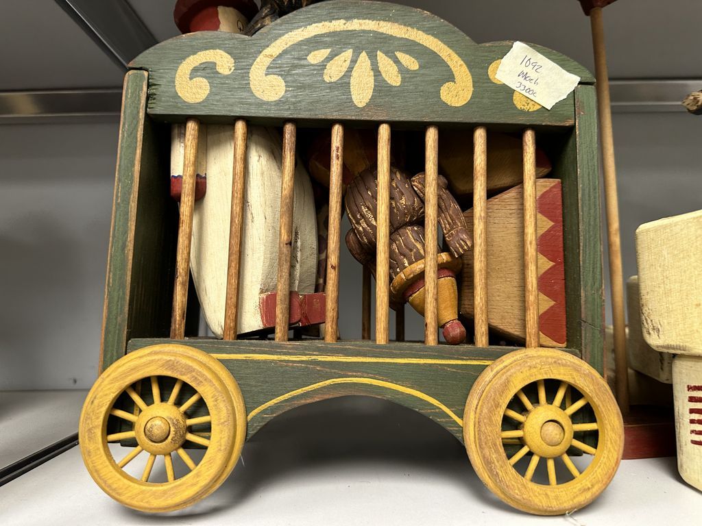 Group of Vintage Wood Circus Toys and Blocks, wheels are damage, Location Right Metal Shelves Group of Vintage Wood Circus Toys and Blocks, wheels are damage, Location Right Metal Shelves