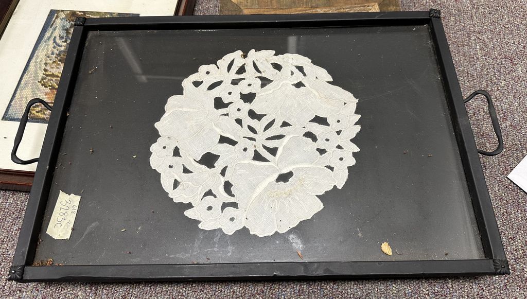 Serving Tray with Crochet, Location Back Metal Shelves Serving Tray with Crochet, Location Back Metal Shelves