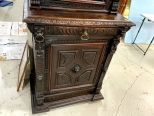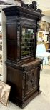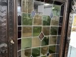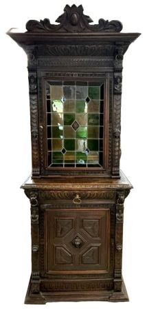 207 94h, 35"w. 23"d Belgian Gothic Style Carved Oak and Stained Glass Cupboard
