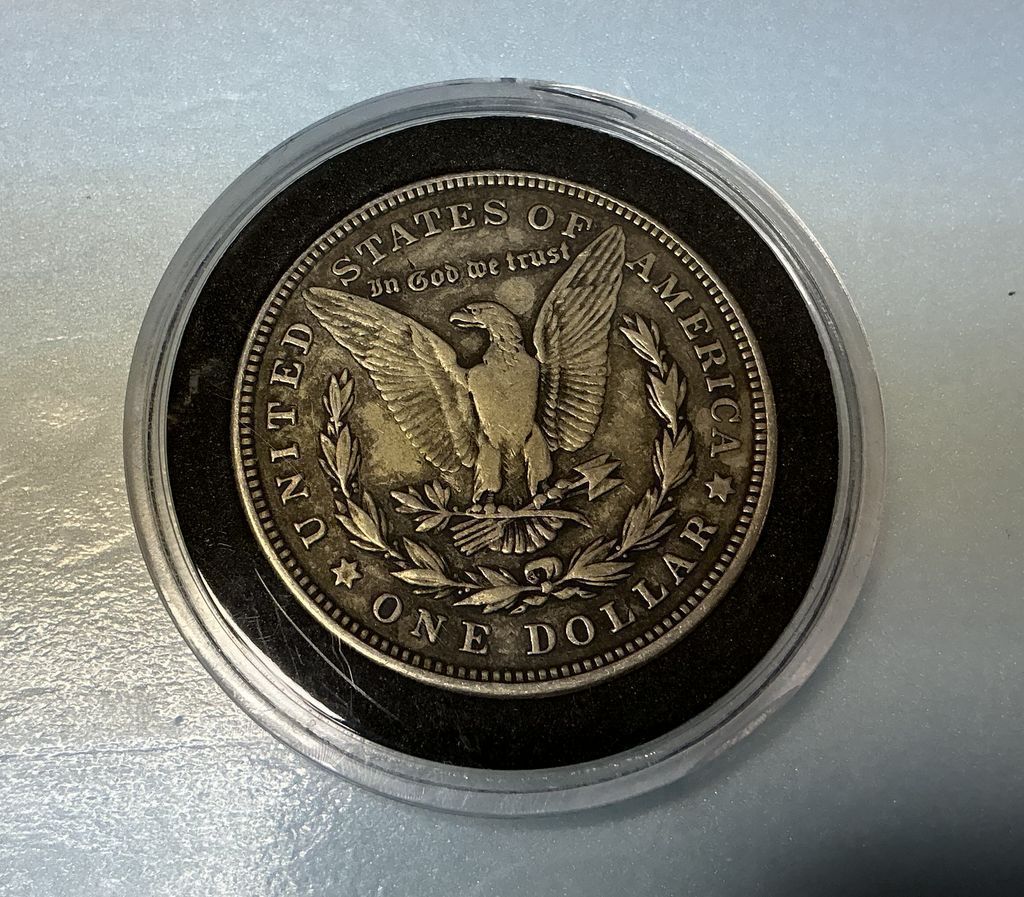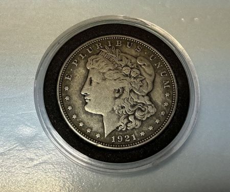 1921 Morgan Silver Dollar, plastic case, fine, Location Back White Case 1 1921 Morgan Silver Dollar, plastic case, fine, Location Back White Case 1