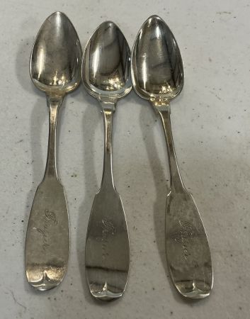 5.5", 1.485 ozt James Hyde Coin Silver Spoons, Frazier Monogramed, Location Front Shelves 5.5", 1.485 ozt James Hyde Coin Silver Spoons, Frazier Monogramed, Location Front Shelves