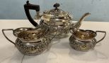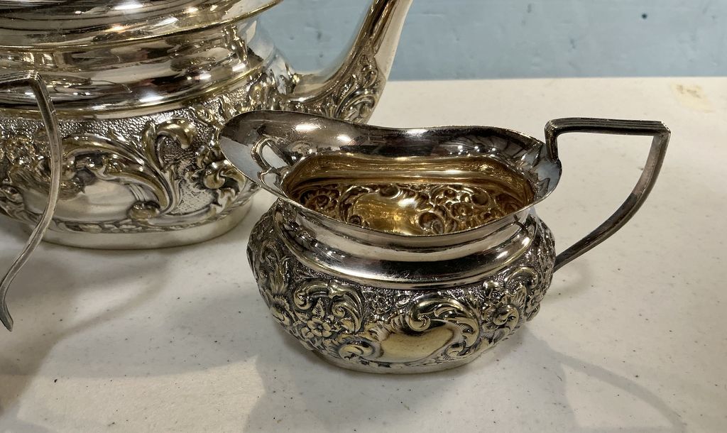 Sheffield Silver Plate Coffee Set, Coffee pitcher, sugar, and creamer, Location Front Shelves Sheffield Silver Plate Coffee Set, Coffee pitcher, sugar, and creamer, Location Front Shelves