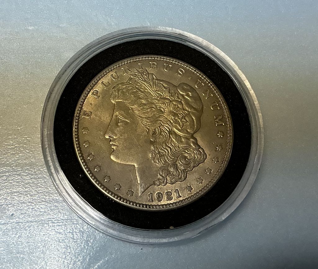 1921 Morgan Silver Dollar, plastic case, fine, Location Back White Case 1 1921 Morgan Silver Dollar, plastic case, fine, Location Back White Case 1