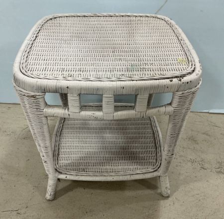 Wicker 22h 22w White Side Table, has age wear Wicker 22h 22w White Side Table, has age wear