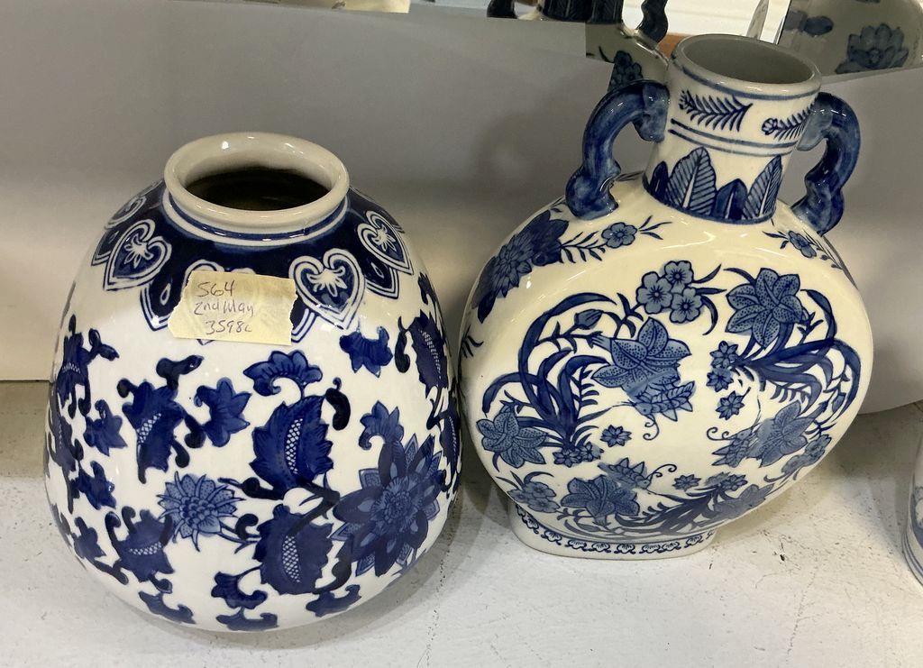 Blue and White Ceramic Flower Vases, Location Front Shelves Blue and White Ceramic Flower Vases, Location Front Shelves