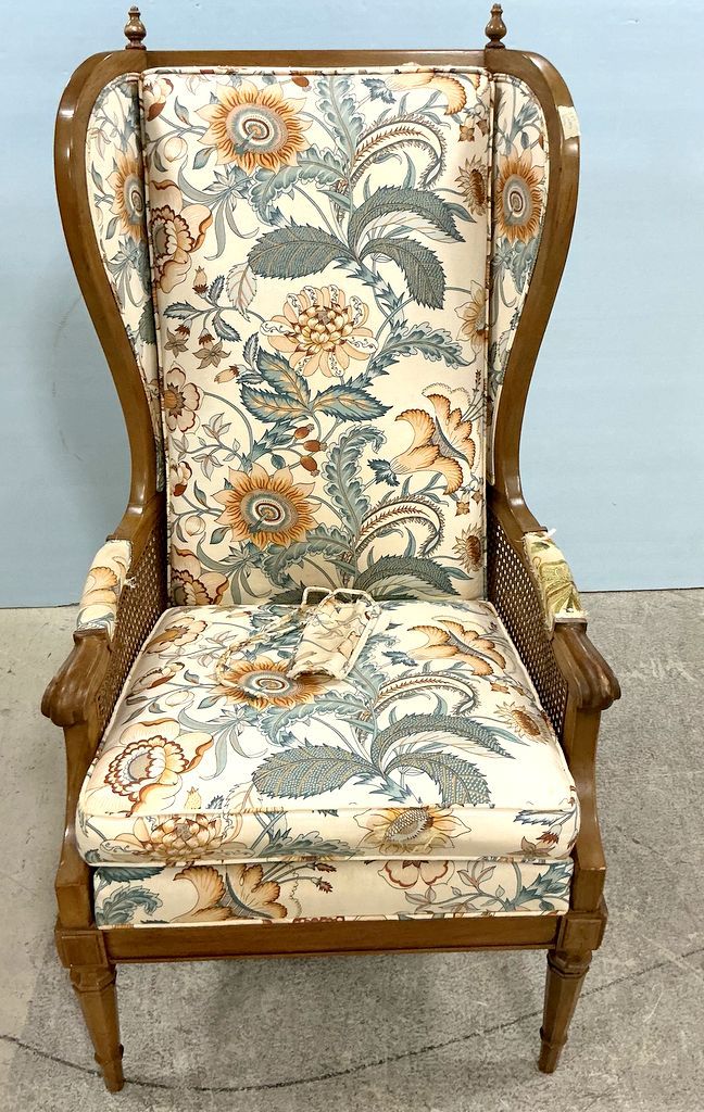 Walnut Fauteuil Wingback Chair, arm cushion fabric needs repair Walnut Fauteuil Wingback Chair, arm cushion fabric needs repair