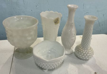 Group of VTG Milk Glass Bowl and Vases, Location Back Metal Shelves Group of VTG Milk Glass Bowl and Vases, Location Back Metal Shelves