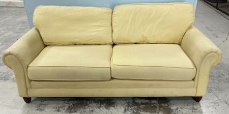 7' Yellow Upholstered Two Cushion Sofa, needs cleaning, Location Back Center 7' Yellow Upholstered Two Cushion Sofa, needs cleaning, Location Back Center