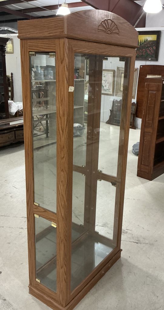 75"h., 30"w. Oak Finish Display Cabinet, has glass shelves 75"h., 30"w. Oak Finish Display Cabinet, has glass shelves