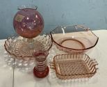 VTG Pink Depression Glassware and Red Compote, Location Back Meta Shelves VTG Pink Depression Glassware and Red Compote, Location Back Meta Shelves