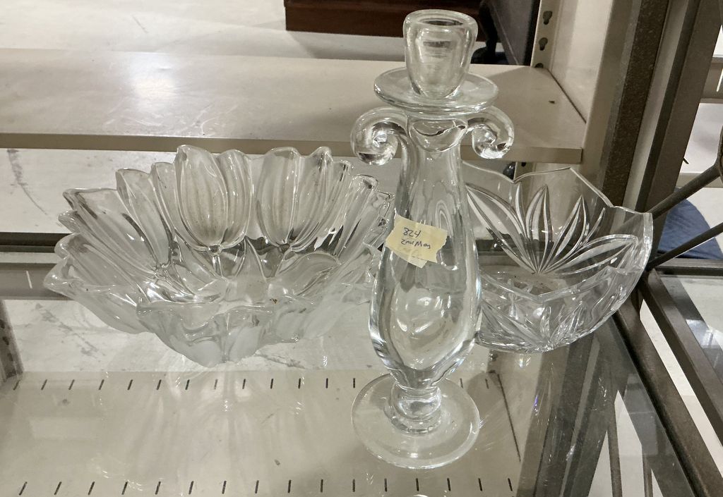 Heavy Pressed Glass Bowls and Candle Holder, Location Right Metal Shelves 47 Heavy Pressed Glass Bowls and Candle Holder, Location Right Metal Shelves 47