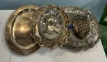 Assorted Silver Plate Serving Trays, Location Back Metal Shelves Assorted Silver Plate Serving Trays, Location Back Metal Shelves