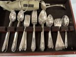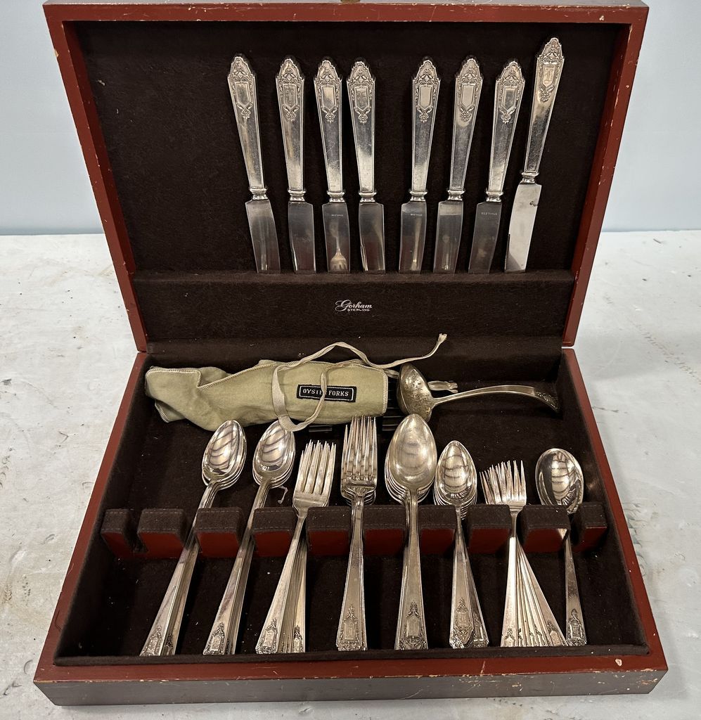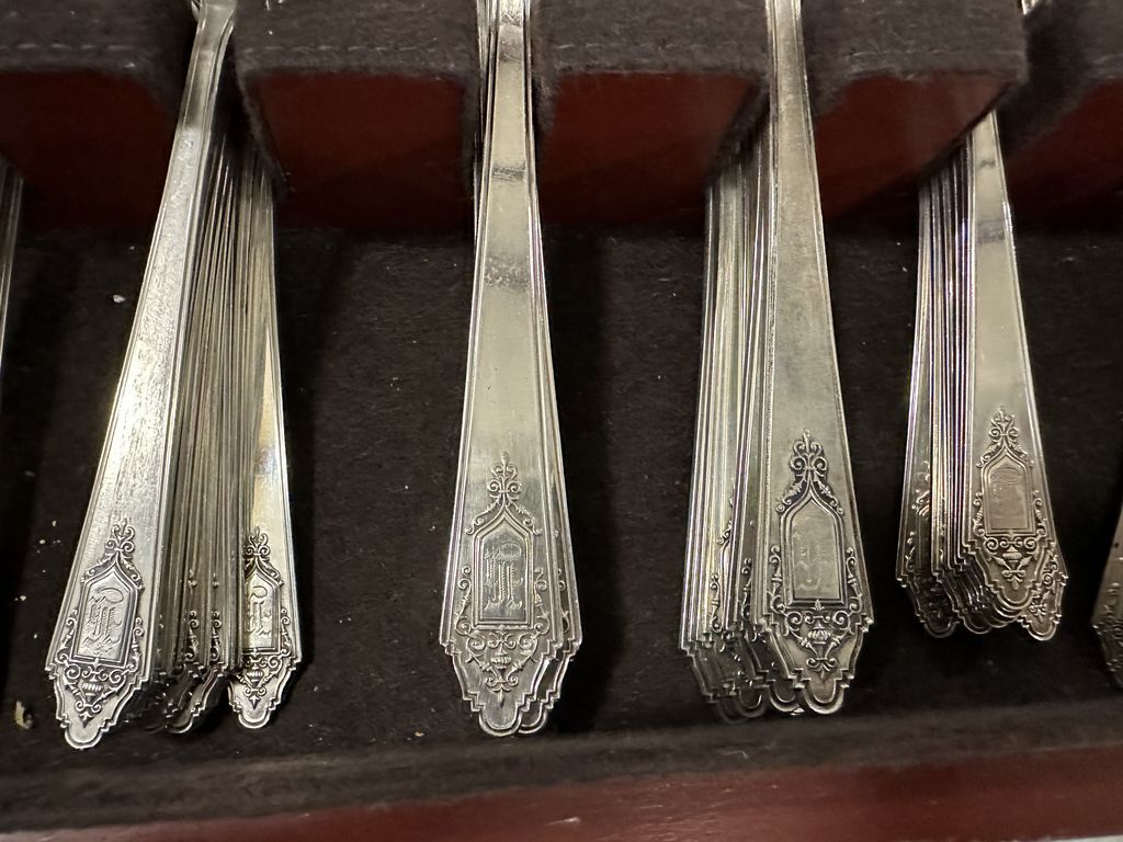 Set of Lunt Treasure Sterling Flatware Set, monogrammed H, 8 ice tea spoons, 8 knives, 8 salad forks, 7 forks, 6 large spoons, 7 spoons, 8 cocktail forks, cream spoon, gravy ladle, good condition, Location Case behind screen Set of Lunt Treasure Sterling Flatware Set, monogrammed H, 8 ice tea spoons, 8 knives, 8 salad forks, 7 forks, 6 large spoons, 7 spoons, 8 cocktail forks, cream spoon, gravy ladle, good condition, Location Case behind screen
