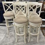 Five Modern White Factory Bar Stools, beige cushion, 33" seat to ground, good condition. Five Modern White Factory Bar Stools, beige cushion, 33" seat to ground, good condition.