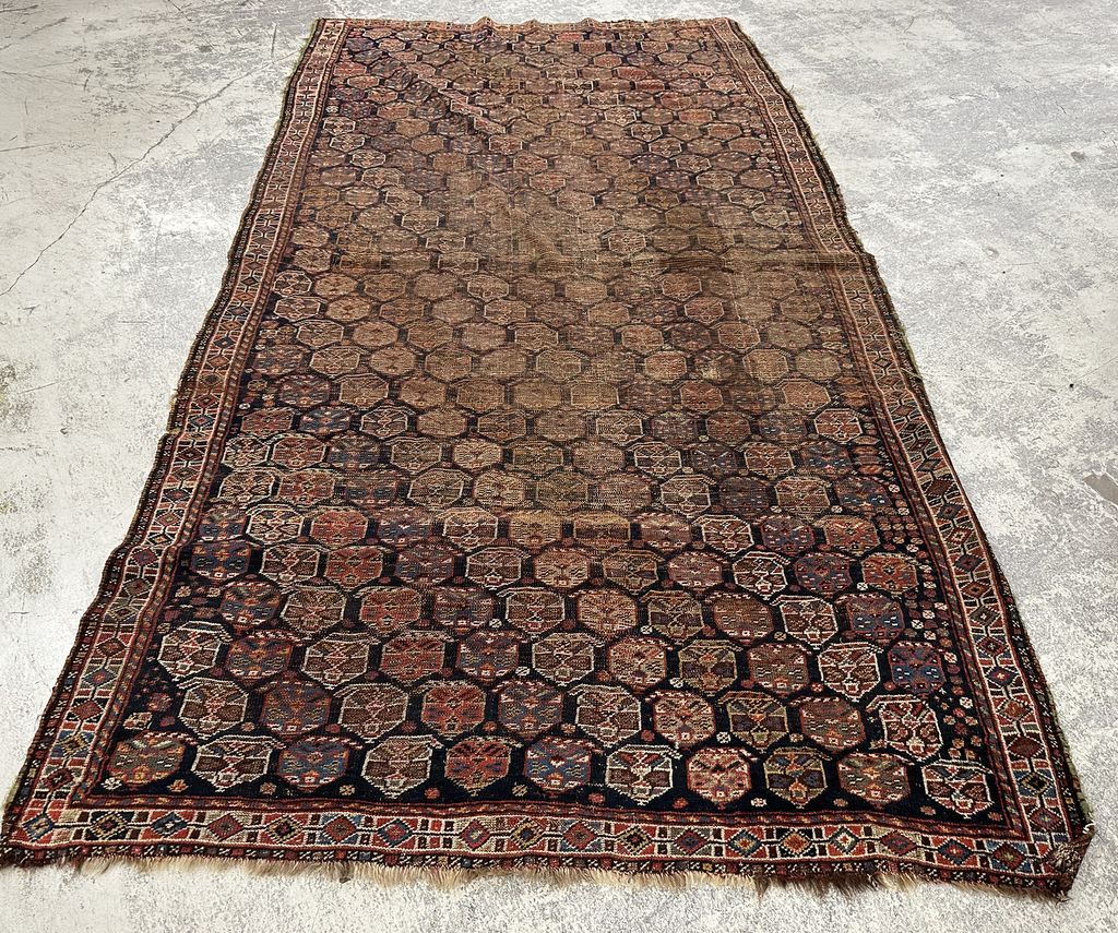 5'7 x 9'10 Semi Antique Persian Wool Rug, has fading, aged wear, has clean tear in center. 5'7 x 9'10 Semi Antique Persian Wool Rug, has fading, aged wear, has clean tear in center.