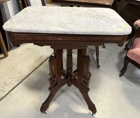 Eastlake Victorian Style Marble Parlor Table, walnut, has had repair, 29"h., 27"w. Eastlake Victorian Style Marble Parlor Table, walnut, has had repair, 29"h., 27"w.