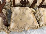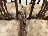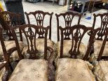 10 Antique Reproduction Chippendale Dining Chairs, two arms, 8 sides, floral cushions, light finish wear. Location Row 5 10 Antique Reproduction Chippendale Dining Chairs, two arms, 8 sides, floral cushions, light finish wear. Location Row 5