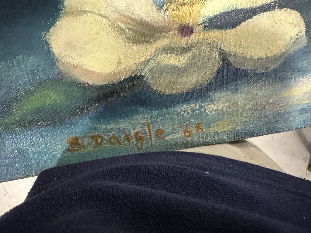 B. Daigle 1968 Still Life of Flowers, unframed, 24"h., 20"w, Location Front Wood Shelves B. Daigle 1968 Still Life of Flowers, unframed, 24"h., 20"w, Location Front Wood Shelves