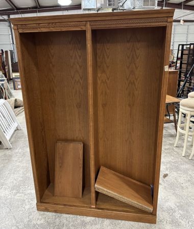 Modern Double Sided Oak Bookcase, does have the shelf pegs, has wood shelves, 73"h., 48"w. Modern Double Sided Oak Bookcase, does have the shelf pegs, has wood shelves, 73"h., 48"w.