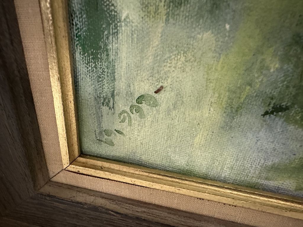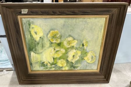 Painting of Flowers Signed, on canvas, 23"h., 26"w, Location Front Wood Shelves Painting of Flowers Signed, on canvas, 23"h., 26"w, Location Front Wood Shelves