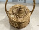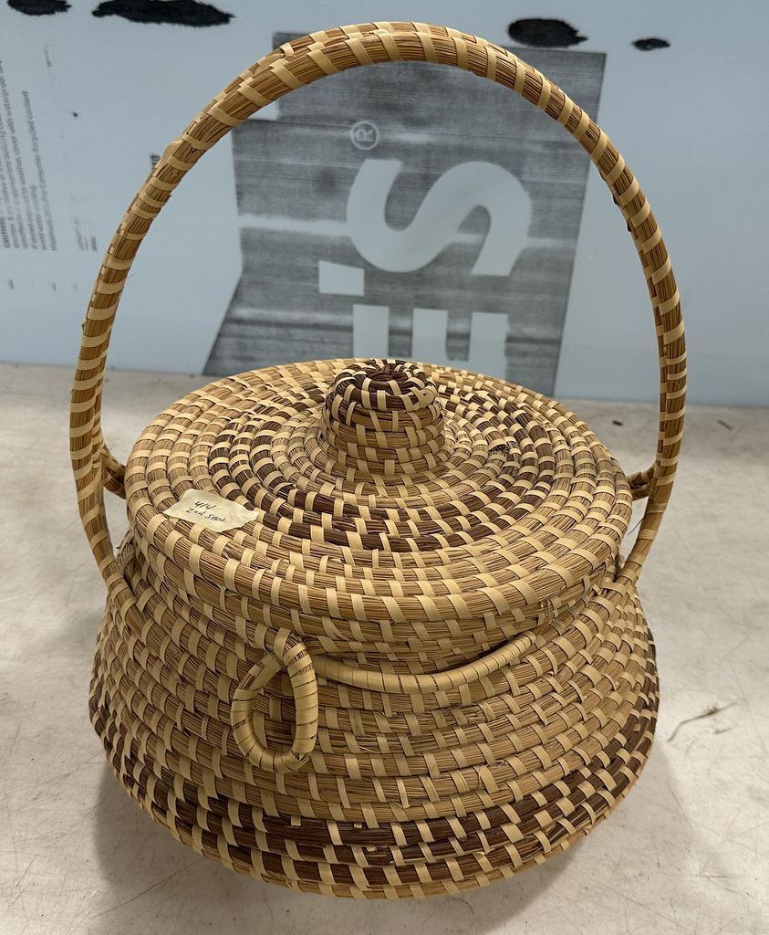 South Carolina Gullah Sweet Grass Basket with lid , Location Front Wood Shelves South Carolina Gullah Sweet Grass Basket with lid , Location Front Wood Shelves