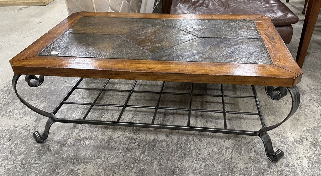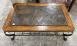 Oak and Stone Style Coffee Table, metal base, 19"h., 50"w. Oak and Stone Style Coffee Table, metal base, 19"h., 50"w.