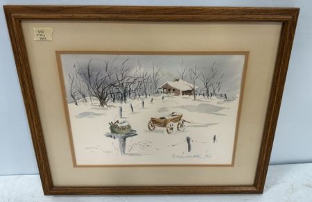B. Burnmoter Signed 1980 Snowy Watercolor, matted, framed, 17"h., 21"w. Location Right Wall B. Burnmoter Signed 1980 Snowy Watercolor, matted, framed, 17"h., 21"w. Location Right Wall