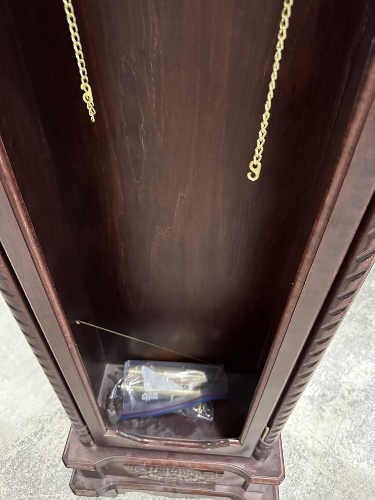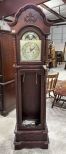 Late 20th Century Cherry Grandfather Clock, made in China, has weights, pendulum, missing door glass, has finish wear, 80"h., 17"w. Location Row 10 Late 20th Century Cherry Grandfather Clock, made in China, has weights, pendulum, missing door glass, has finish wear, 80"h., 17"w. Location Row 10