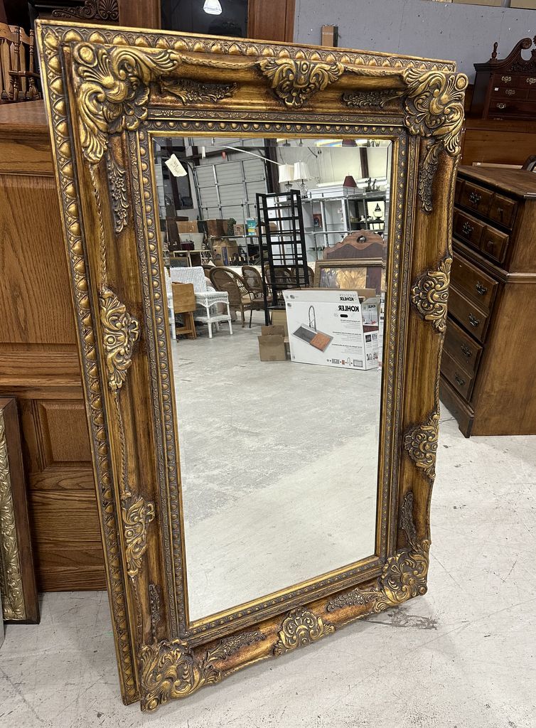 Large Wood Gold Gilt Wall Mirror, 62"h., 38"w. Large Wood Gold Gilt Wall Mirror, 62"h., 38"w.