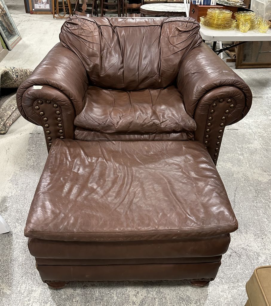 Dark Red Vinyl Leather Chair and Ottoman, light wear. Dark Red Vinyl Leather Chair and Ottoman, light wear.