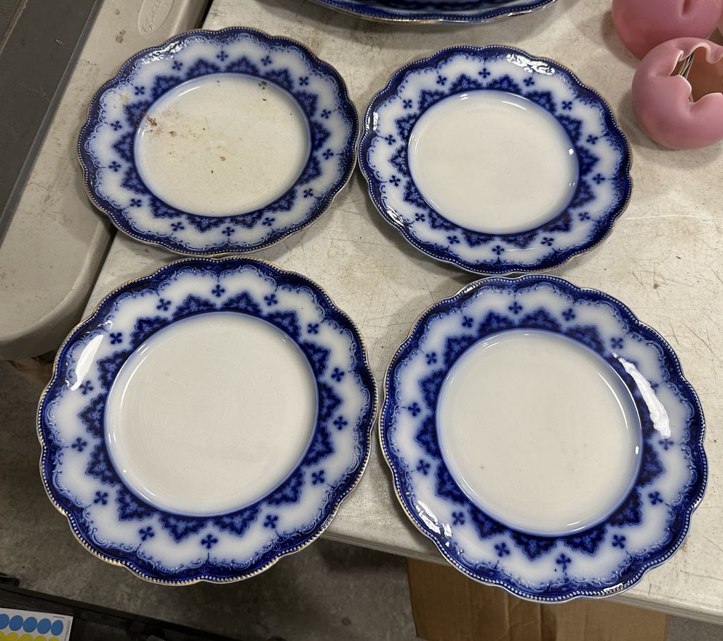 Four Blue and White Antique Plates, Location Back Metal Shelves Four Blue and White Antique Plates, Location Back Metal Shelves