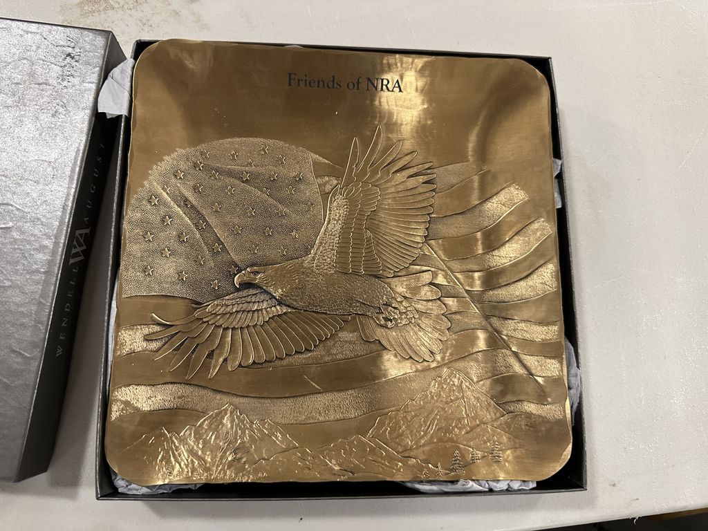 Wendell August NRA Bronze Plaque, in case, 9", Location Right Metal Shelves Wendell August NRA Bronze Plaque, in case, 9", Location Right Metal Shelves
