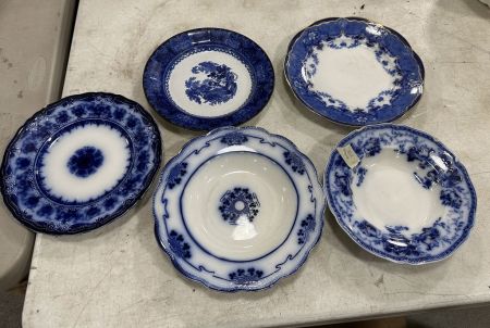 Five Antique Blue and White Porcelain Plates, some with hairline cracks, Location Back Metal Shelves Five Antique Blue and White Porcelain Plates, some with hairline cracks, Location Back Metal Shelves
