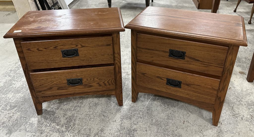 Pair of Oak Nightstand, two drawers, one with worn top finish, 25"h., 26"w. Pair of Oak Nightstand, two drawers, one with worn top finish, 25"h., 26"w.